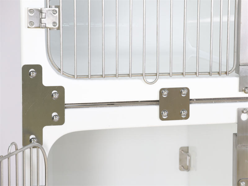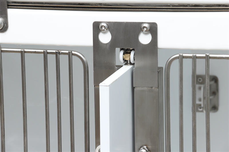 Nozzle lan selang semprotan sing wis diinstal, sistem saluran banyu kanthi saringan, lan soket listrik ngowahi saka mung kandhang dadi stasiun kerja multifungsi. Peralatan listrik kayata mesin anestesi, konsentrator oksigen, lan bantalan pemanas bisa dipasang ing soket lan digantung saka palang tengah lawang. Lawang ngarep Kandhang Asu Modular Waterproof Fiberglass Waterproof ngidini instalasi sunshades liwat tikungan berbentuk U, ngalangi sinar srengenge nalika dadi penghalang angin.